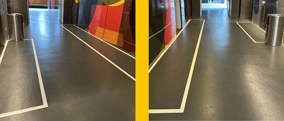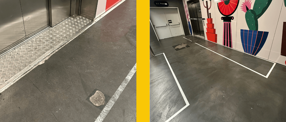 El pavimento existente en los núcleos de ascensores era de microcemento, una solución estética pero no adecuada para el uso real del espacio, ya que soporta tránsito continuo de personas y circulación de traspaletas vinculadas a la actividad logística y comercial del edificio. Este uso intensivo provocó un desgaste prematuro del pavimento original.
